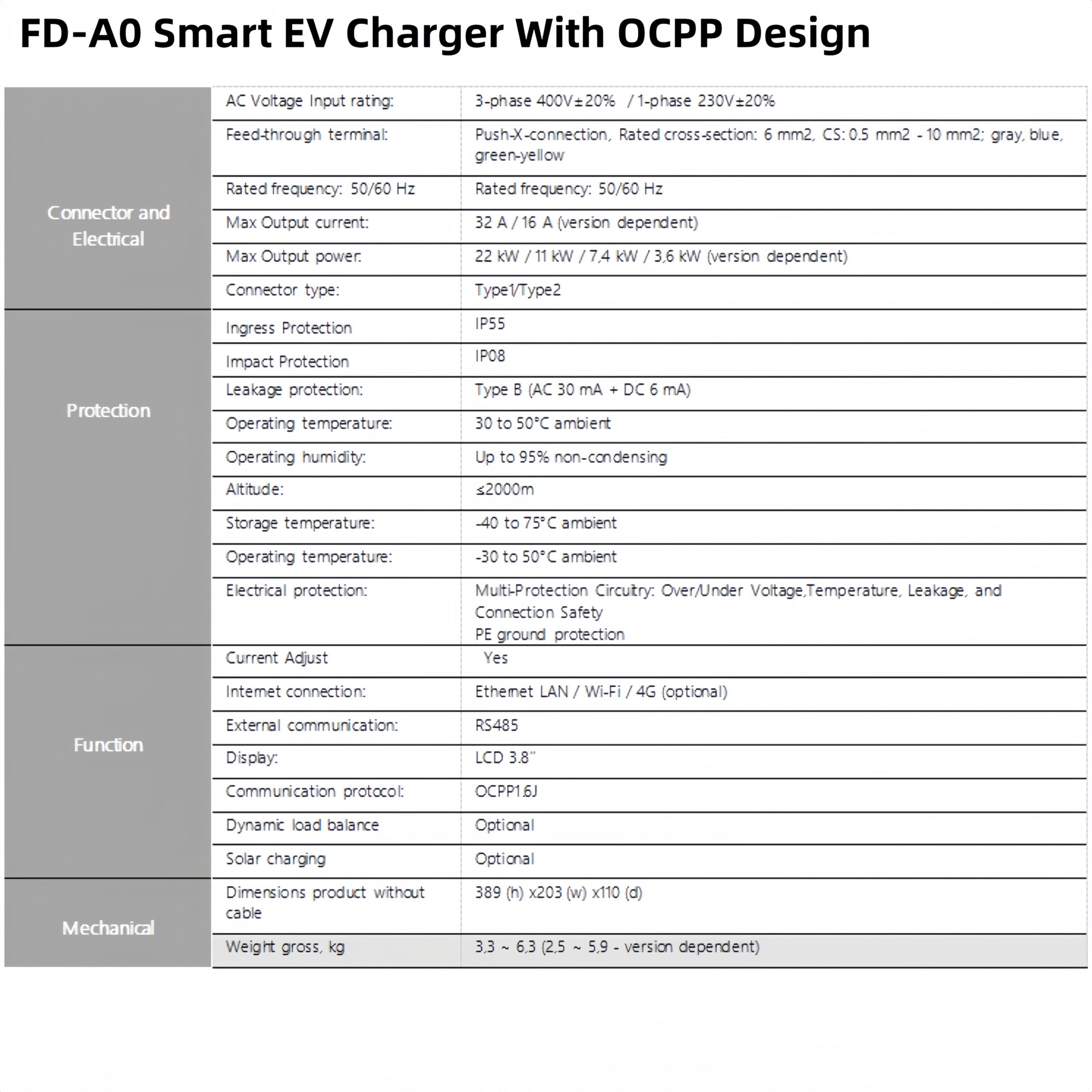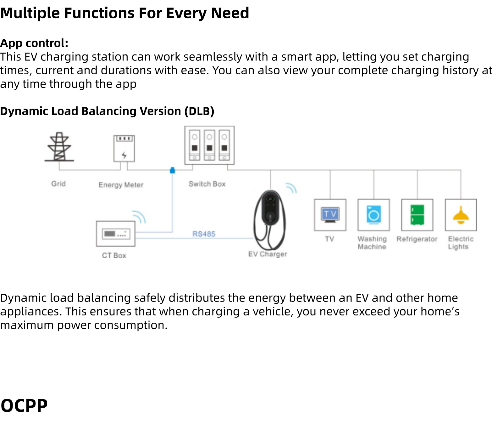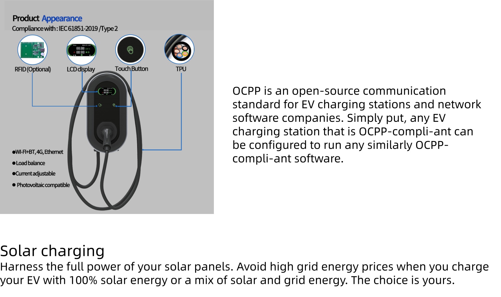 Function: App Control/Rfid Card Swipe/OCPP/Dynamic Load·Balancing(Optional)/Solar charging(Optional)